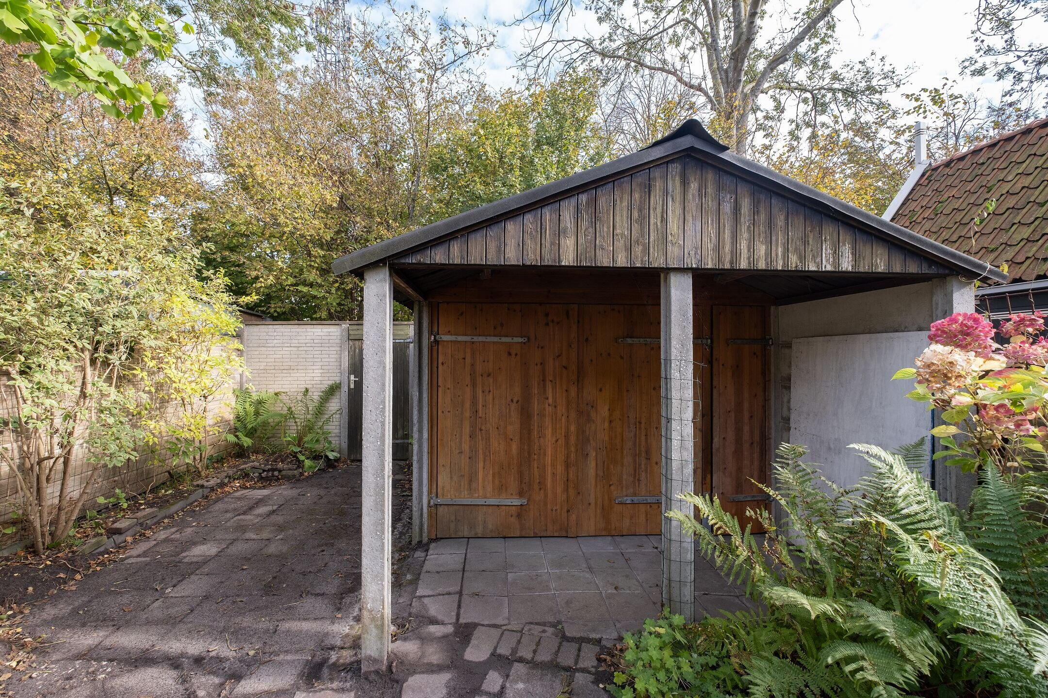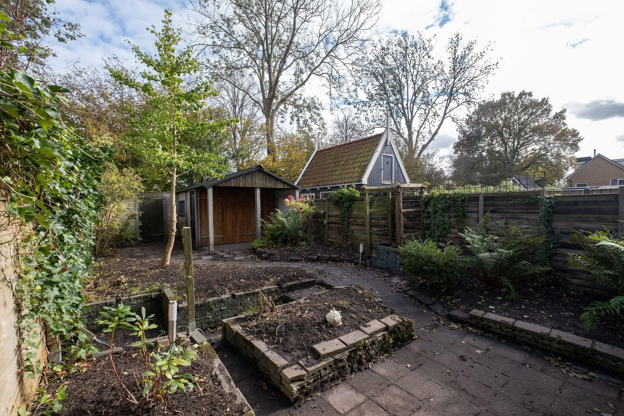 Een zonnige tuin met privacy. De tuin aan de achterzijde ligt op het oosten en biedt veel privacy. Dankzij de openslaande deuren in de uitgebouwde woonkamer stap je zo naar buiten om te genieten van de ochtendzon. Achterin staat een houten berging met elektra, handig voor fietsen of tuingereedschap.