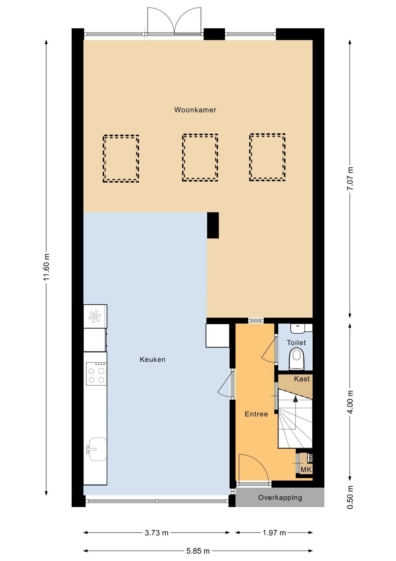 - 81 m² (13,00 meter diep en 6,22 meter breed)
