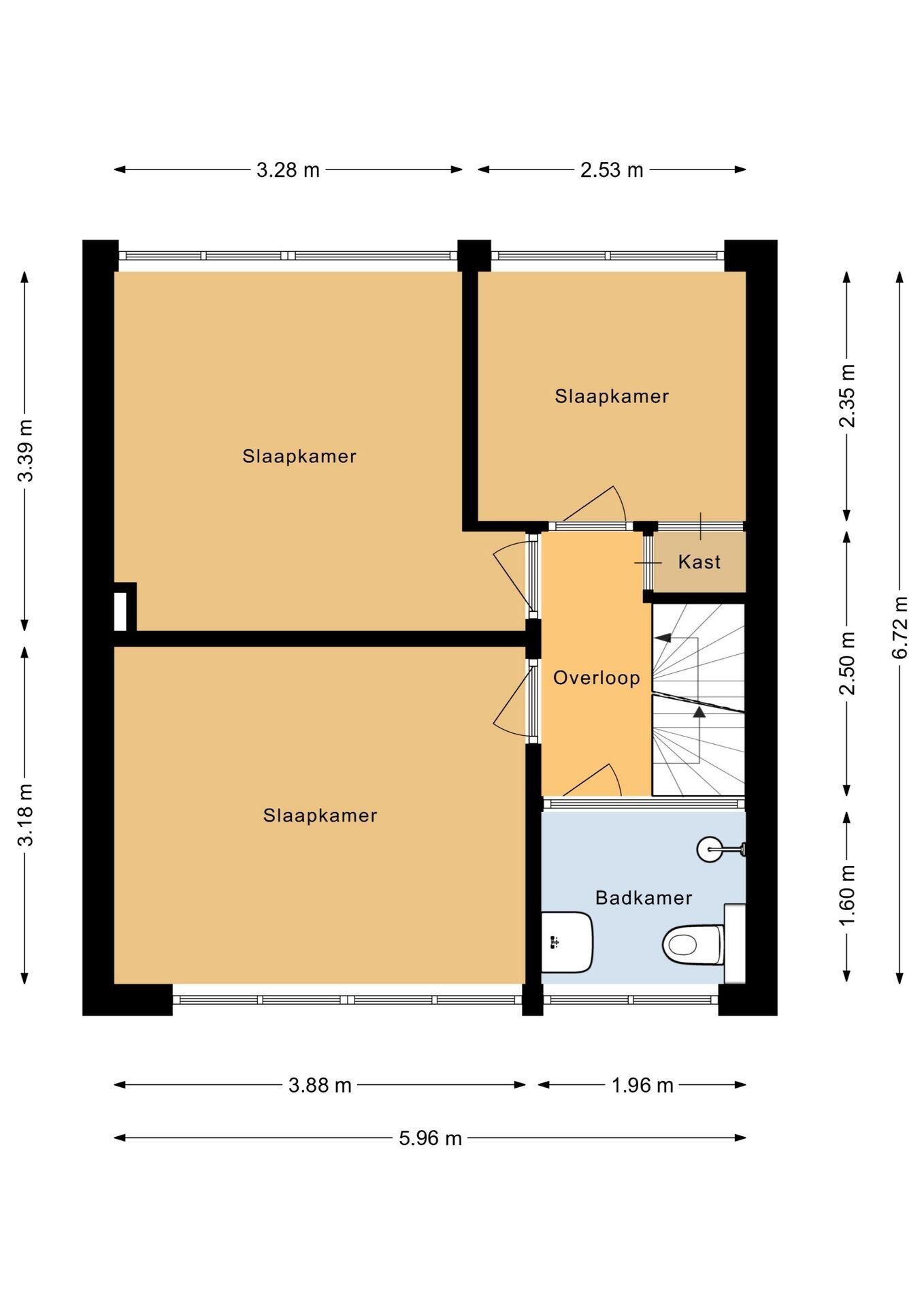 Op de eerste verdieping vind je drie slaapkamers, een kleine wasruimte met aansluitingen voor wasmachine en droger en de badkamer. Alle slaapkamers zijn voorzien van kunststof kozijnen (achterzijde vernieuwd in 2010). De badkamer beschikt over een douche, toilet en wastafel, netjes en functioneel ingericht.